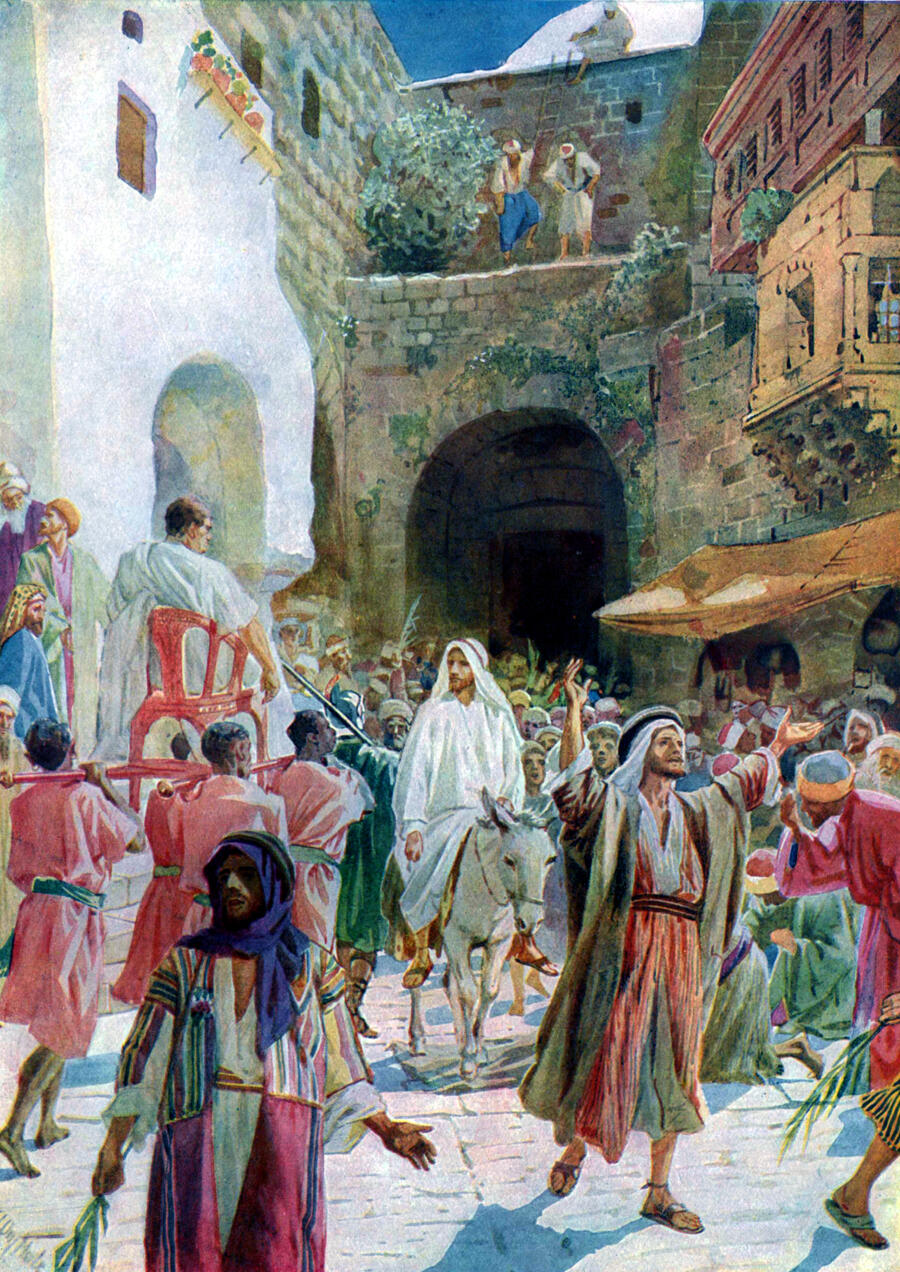 So Jesus went down into the deep valley, and up a steep way into Jerusalem, and as the crowd pushed and struggled through the narrow streets, people looked in amazement from their windows, and all the city was in a tumult.